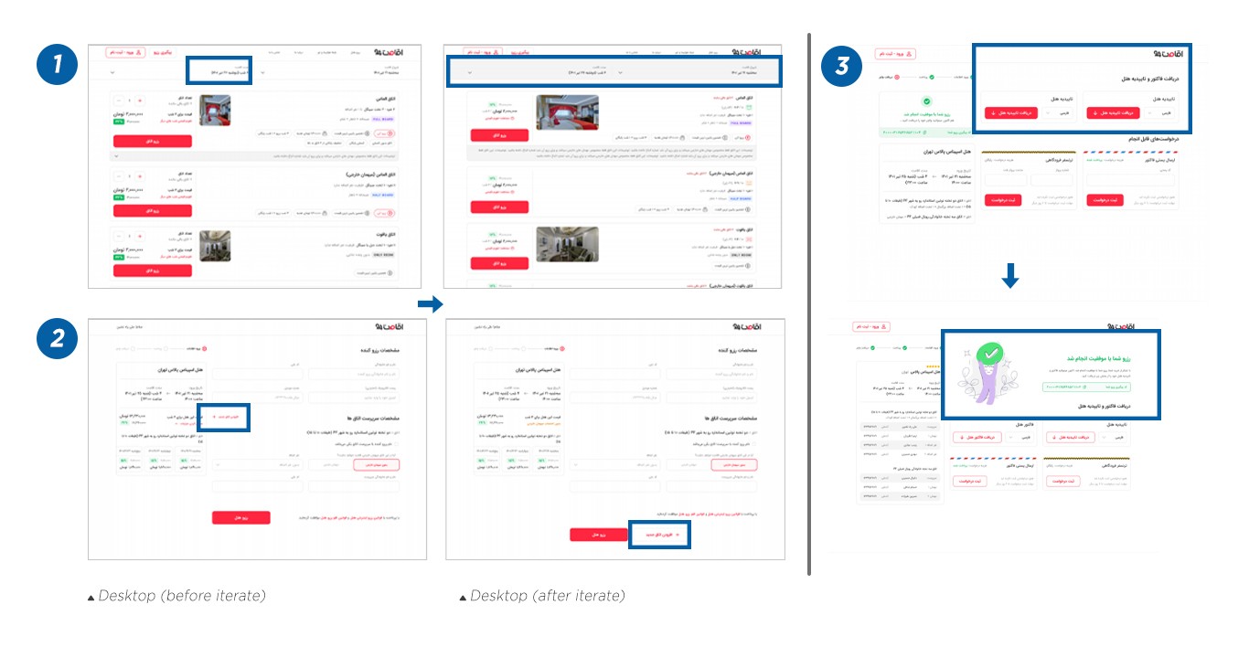 Identified Problems: Investigations into the fields and content of each stage of the hotel reservation journey revealed that different types of users were being directed to the same path. Over years of product development, each new user group's needs had been layered onto the existing process, resulting in increasingly complex and lengthy reservation forms. Our first solution was to personalize the journey for different user groups. - B2C (Individual Users): Such as Mehdi, who typically travels 4 to 6 times a year and seeks online options mainly influenced by price and opinions. - B2B (Agencies): Like the Sepidbal Travel agency, which often looks for hotel reservations and values good support and reasonable pricing when choosing service providers.